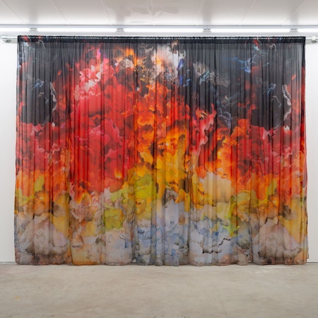 For Los Angeles and Brisbane based artist and Palawa woman Jemima Wyman, these enforced or inherited systems of control naturally generate friction: between the public, restless with inaction and excuses, and the agents of the state, be it military or police. In Haze… (2020-21) the fires of activism give rise to coloured gradations of smoke, categorised by the artist as part of her labourious hand-cut process and documented precisely in the work’s full title. Sublimation printed onto chiffon, the result suggests the rising fume of a bushfire, but each plume is sampled from a flame of protest or that action’s response from the powers that be in the form of smoke grenades or flash grenades. The result creates a panorama of protest and resistance.