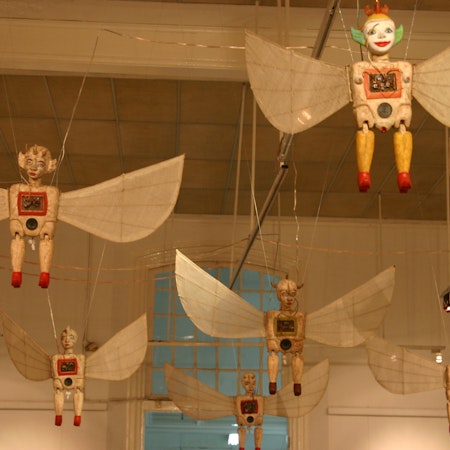Representing the failed dreams of a reformed nation with a background of grotesque figures and rollicking scenes, the angels are depicted partially complete and suspended in a status quo. Heri's quasi-human dolls are reminiscent of eighteenth century automata and robots. The role of an automaton is to question the status and actions of human beings and, in connection with Heri's angels, the consequences of human actions. The dolls also mirror the figures in his painting: the wayang.