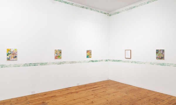 For Actually Energy Help Light, David Egan presented several different bodies of paintings and text. A new work was painted using pigment from the beautiful yet noxious flowering plant Morning Glory, a climbing weed that competes with cultivated plants by growing laterally, stopping light from penetrating its blanketing surface. This painting changes colour in time, it is a pictorial registration of the decomposing plant matter. Other paintings extend Egan's Painting Playing Cards series (2013–), which invoke a form of decorative artifice introduced to the back of the formerly blank playing card in the nineteenth century to address a social epidemic of card cheating. Asparation Frieze produces a painting of architectural proportions, which cannot be viewed in its entirety from any one vantage, always gesturing to the peripheral. Egan’s written text works produce a meta-fictional space in which the concerns of the paintings criss-cross in a succession of mental images.
