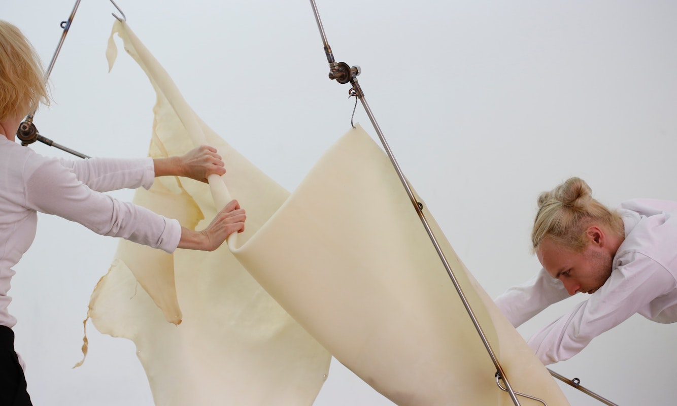 //audio-description transfigured as generative, vibrational practice / movement improvisations / hide(s) / work -- works -- work sites / articulated armatures / materials under tension / skin(s) / boundaries of encounters / resistance / responsiveness / contraction and release / transmission from body to material, from material to body, from material to material, from body to body / scores for encounters between bodies and material histories / taxonomies of touch / imprints of contact / distributed authorship / activation / elasticity / vibrational silence / private handovers / public handovers / removal / retreat / return / repeat //