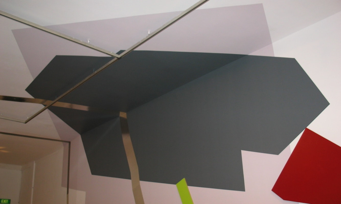 Challenging the structure and presentation of the traditional curated group show, the exhibition aimed to foster experimentation and allowed the artists to explore and use the gallery space in innovative new ways, under the theme “Inverted Topology”. To invert is to turn something upside down or inside out. Topology is the branch of geometry which studies those properties of figures or solid bodies, which remain invariant under all structural alterations. In relating this theme to the art that Andrews, Finlayson, Hinkley, Jenkins and Takasaka created, Inverted Topology signalled a rupture between the physical structures of their work; a break with the boundaries of their individual art practice, which resulted in a cross pollination of their work. As all of the artists deal in aspects of geometric abstraction, the collaboration resulted in an angular fusion of overwhelming geometric intensity. In the form of wall drawings and sculpture, the artists were able to blend their individual preoccupations with abstraction, interacting with and overlapping each other to have created a hybrid work which referenced abstract art, design, architecture and the urban landscape.