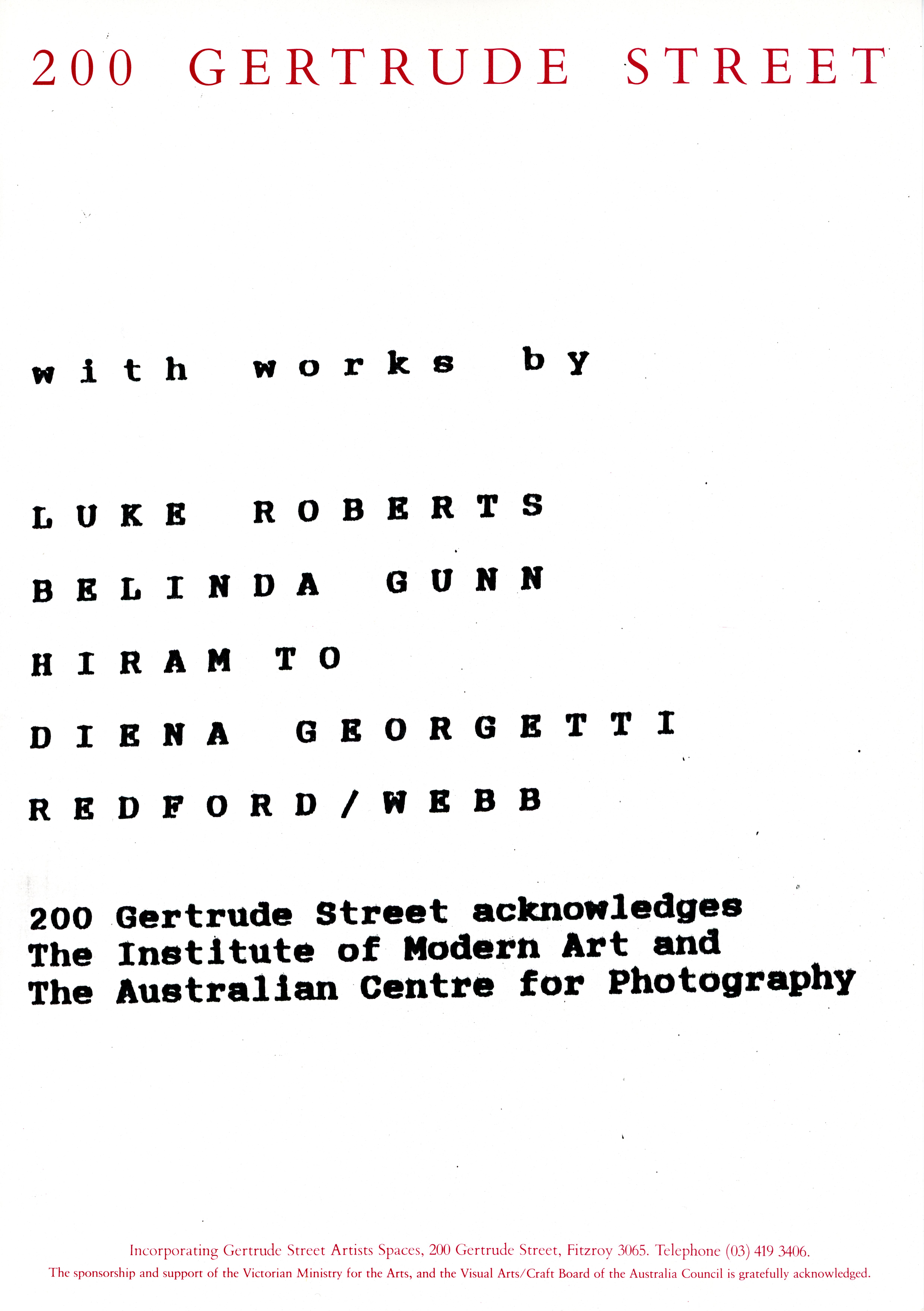 200 Gertrude Street, FitzroySalle de Reconnaissance was a group show curated by Michele Helmrich, featuring works by Diena Georgetti, Belinda Gunn, Redford/Webb, Luke Roberts and Hiram To. Presented by Gertrude Contemporary at 200 Gertrude Street from the 9th - 30th September, 1989.
