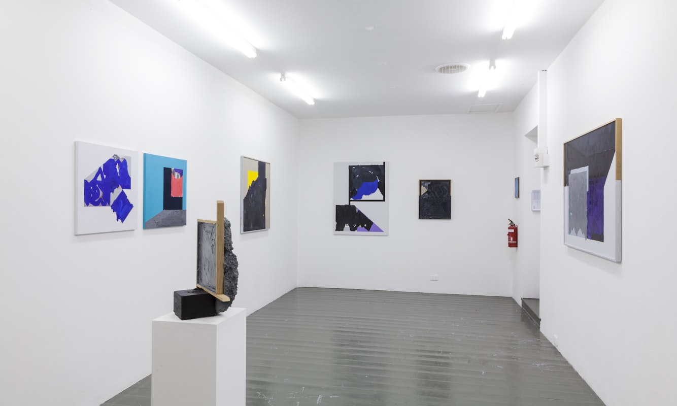 Collapsing View was an exhibition of new work by studio artist Sean Bailey. Bailey’s practice entails multiple and complex processes of concealment informed by surrealist and Dadaist methods of chance. He typically combines mixed-media collage with painterly abstraction — often beginning a painting with a found image over which he paints layers of different colours and shapes. The result of this process is a hidden image whose now invisible content nevertheless informed the composition of the painting. Bailey had begun making sculptures utilising a similar working method with concrete, linen and wooden materials. Collapsing View brought together a series of twelve new paintings and a sculpture, each of which explore notions of transformation, renewal and decay.