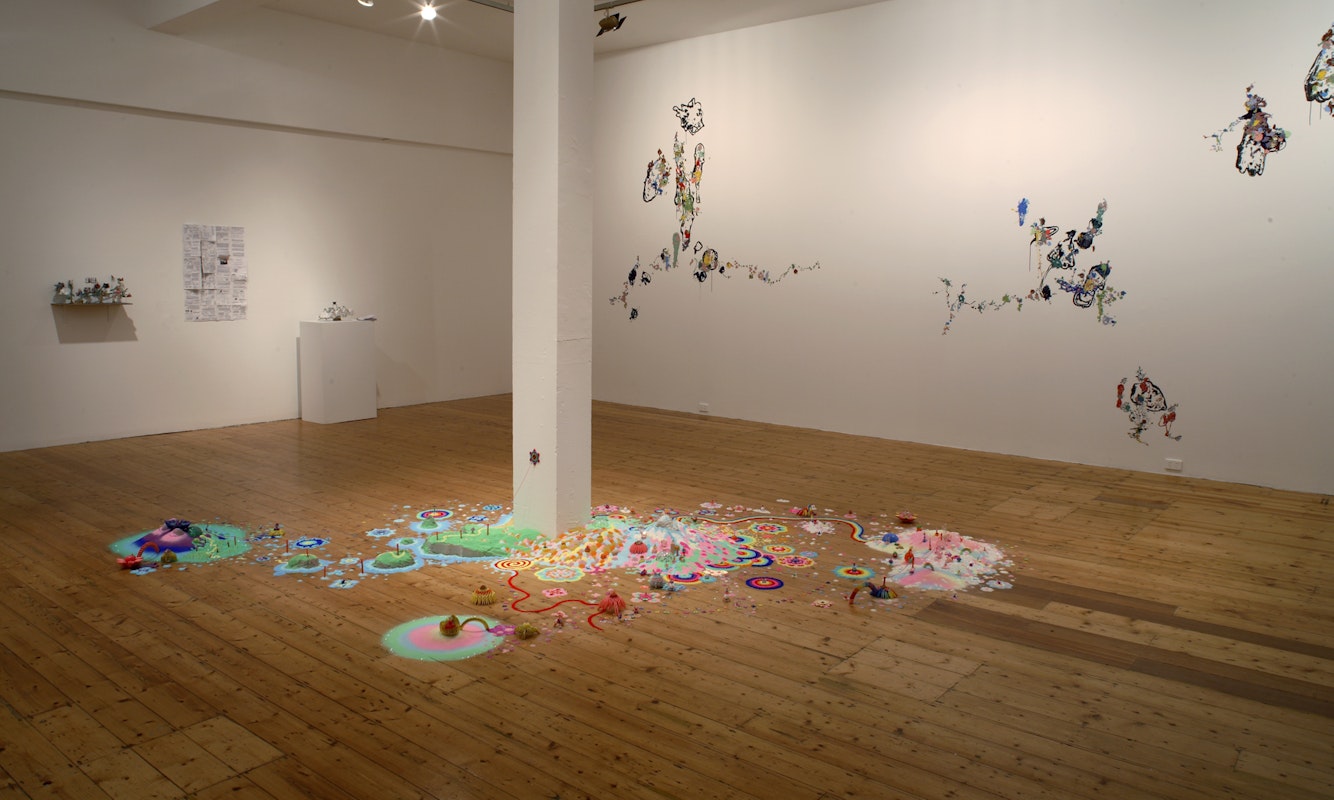 Terra Incognita brought together six Australian and international artists who drew on the language of cartography to chart an internal landscape of ideas, memories and emotions. Their maps gave visual form to the intangible conceptual forces that shape our lives just as concretely as our physical surroundings. While these intuitive maps may not have been factual, they were true, and they offered the viewer a passage through interior worlds more profound than those in the pages of an atlas. For this exhibition, Nicole Andrijevic made floor-based topographical landscapes, formed from layered mounds of multi-coloured sand. Owing more to the world of imagination than to geography, these miniature mountains and islands in acid shades of yellow, pink and blue stretched across the floor like an archipelago in some psychedelic republic. Simon Evans made drawings of lists, charts and maps that created order out of the daily challenges of life - relationships, career, anxieties, health - often in a humorously arbitrary way. Pieced together with notebook paper, biro, tape and correction fluid, the work had a homemade, diaristic quality, and these humble materials became Evans' tools to map the human condition. Gertrude Contemporary gratefully acknowledges the British Council's support in bringing Simon Evans' work to Melbourne. Bridget O’Brien’s wall-paintings stemmed from an interest in the links between mapping and landscape painting and alternatives to Western cartographic traditions. The abstract forms in her work were reminiscent of land-masses, but also suggested motion and the idiosyncratic ways we perceive and move through the space that surrounds us. Jessica Rankin embroided text and images onto sheer organdy to make “brain-maps”, ethereal wall-hangings that offered a glimpse into the workings of the mind. Fragments of conversations, dreams, memories and day-to-day observations mingled in a delicate network of stitched phrases and images that mapped our elusive thought processes. Christian Thompson’s work questioned dominant representations of Australian indigenous culture, by using video, performance and photography to chart what he termed a 'complex series of identities.' Through his work he structured his identity as an indigenous Australian and a conceptual artist, setting the coordinates for his own cultural map. Simon Yates’ ongoing project “Universal Cloaking Device” presented as nothing less than an attempt to map the world of art and ideas. His ingenious constructions and drawings combined high concepts, pop culture, visual puns and word play to build a kinetic, map-like metaphor for the inventive and associative mind of the artist.